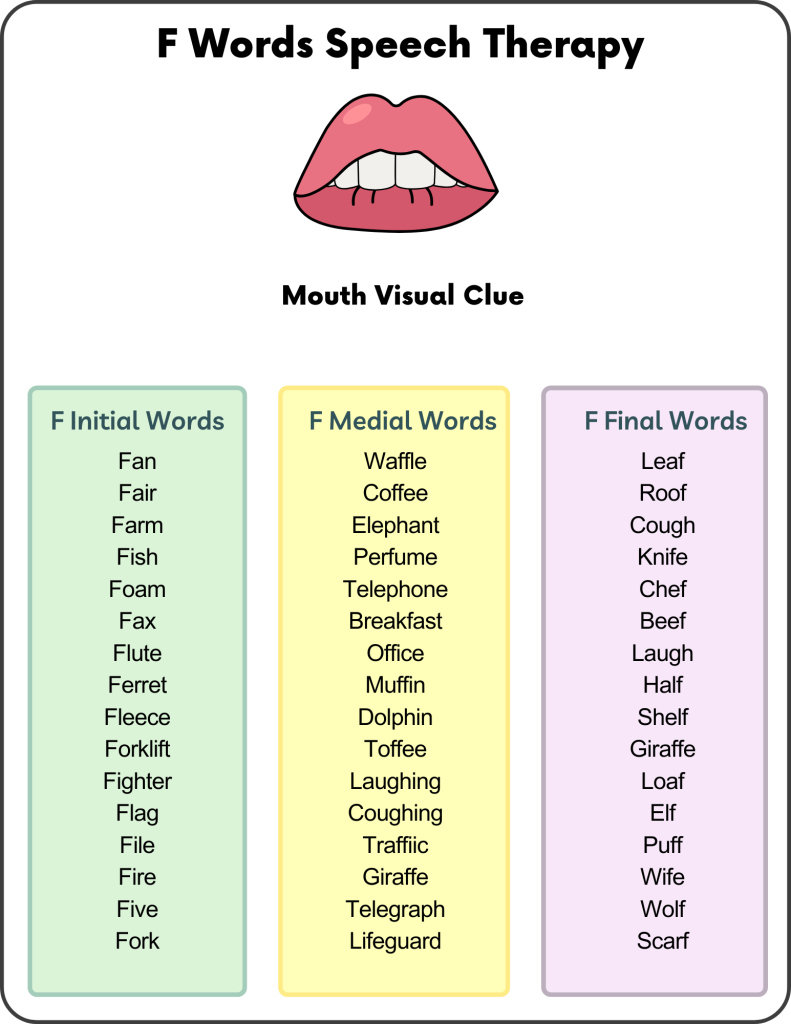 If your child swaps F for P (e.g., “pan” for “fan”) or drops final F (e.g., “lea” for “leaf”), a speech therapist can help with lip positioning.