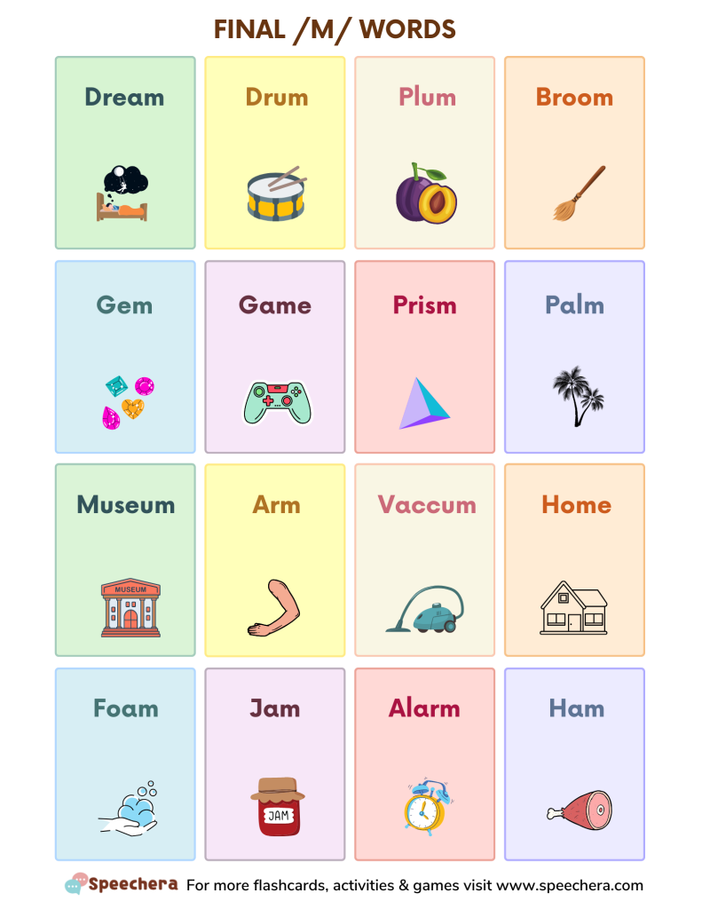 Free Final M sound words for Speech Therapy printable featuring words with the “M” sound can be a useful tool for improving pronunciation and vocabulary. Some of the flashcards included in these worksheets are:- Dream, Drum, Plum, Broom, Gem, Game, Prism, Palm, Museum, Arm, Vaccum, Home, Foam, Jam, Alarm, Ham