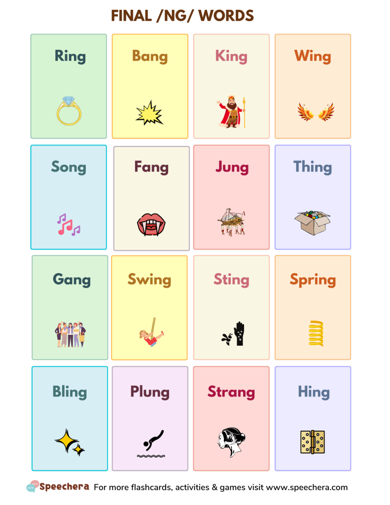 Free Final Ng sound words for Speech Therapy printable featuring words with the “Ng” sound can be a useful tool for improving pronunciation and vocabulary. Some of the flashcards included in these worksheets are:- Ring, Bang, King, Wing, Song, Fang, Jung, Thing, Gang, Swing, Sting, Spring, Bling, Plung, Strang, Hing.