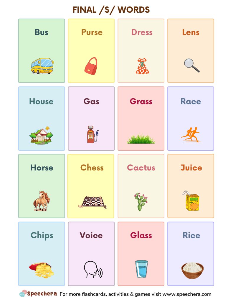 Free Final S sound words for Speech Therapy printable featuring words with the “S” sound can be a useful tool for improving pronunciation and vocabulary. Some of the flashcards included in these worksheets are:- Bus, Purse, Dress, Lens, House, Gas, Grass, Race, Horse, Chess, Cactus, Juice, Chips, Voice, Glass, Rice.