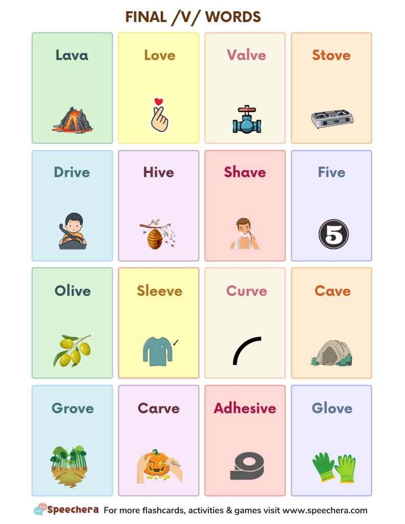 Free Final V sound words for Speech Therapy printable featuring words with the “V” sound can be a useful tool for improving pronunciation and vocabulary. Some of the flashcards included in these worksheets are:- Lava, Love, Valve, Stove, Drive, Hive, Shave, Five, Olive, Sleeve, Curve, Cave, Grove, Carve, Adhesive, Glove.