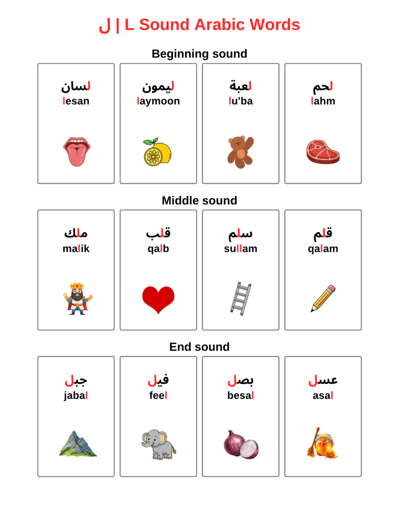 تركز هذه الأنشطة على تنمية الوعي الصوتي ومهارات النطق، حيث يتعلم الطفل التعرف على صوت /ل/ في بداية الكلمة ووسطها ونهايتها بطريقة سهلة وممتعة.