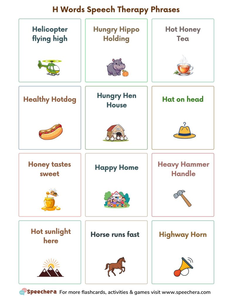 H Words Speech Therapy Phrases Worksheets. Download this free set of speech therapy alliteration worksheets featuring phrases for the /h/ sound. Kids practice repeating short phrases such as Helicopter flying high, Hungry Hippo
