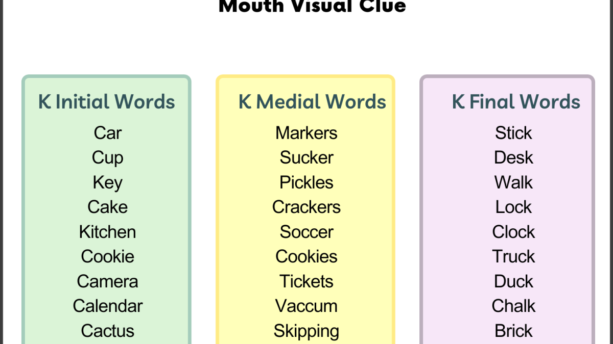 - Medial K Words: These have K in the middle, such as “marker” or “pickles,” blending K with other sounds.