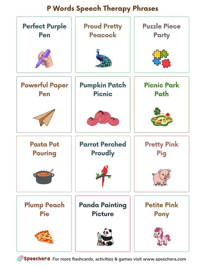 P Words Speech Therapy Phrases Worksheets. Download this free set of speech therapy alliteration worksheets featuring phrases for the /p/ sound. Kids practice repeating short phrases such as perfect purple pen, proud pretty peacock, puzzle piece party, powerful paper pen, pumpkin patch picnic, picnic park path, panda painting picture etc to improve articulation, auditory discrimination, phonological awareness, and fluency. Useful for SLPs, special education teachers, early intervention, autism therapy, and at-home practice.