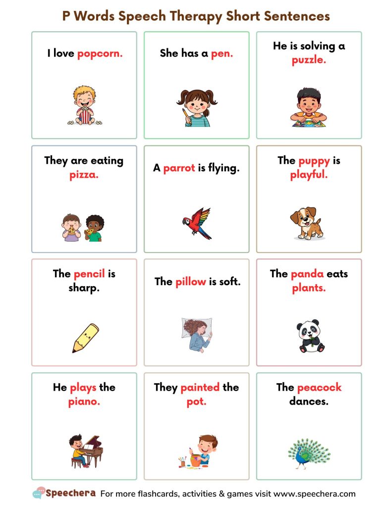 P Words Speech Therapy Short Sentences Worksheets Download this free set of speech therapy worksheets designed to target the /p/ sound using short, simple sentences. Children practice repeating sentences such as “I love popcorn, She has a pen, He is solving a puzzle, They are eating pizza, A parrot is flying, The puppy is playful, and The pencil is sharp. These short sentence activities help improve articulation, phonological awareness, sentence fluency, and sound carryover. This resource is ideal for SLPs, special education teachers, early intervention, autism therapy, and at-home speech practice.