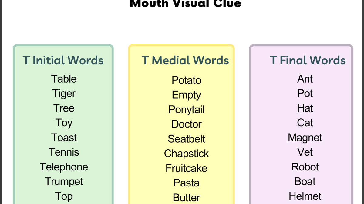 Below are curated lists of T words for each position, suitable for home use and integrated into daily activities.
