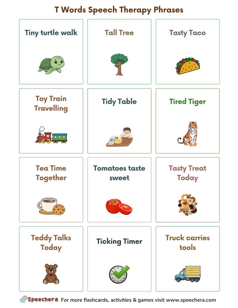 T Words Speech Therapy Phrases Worksheets. Download this free set of speech therapy alliteration worksheets featuring phrases for the /t/ sound. Kids practice repeating short phrases such as Tiny turtle walk, Tall Tree, Tasty Taco, Toy Train Travelling, Tidy Table, Tired Tiger, Tea Time Together, etc…. to improve articulation, auditory discrimination, phonological awareness, and fluency. Useful for SLPs, special education teachers, early intervention, autism therapy, and at-home practice.