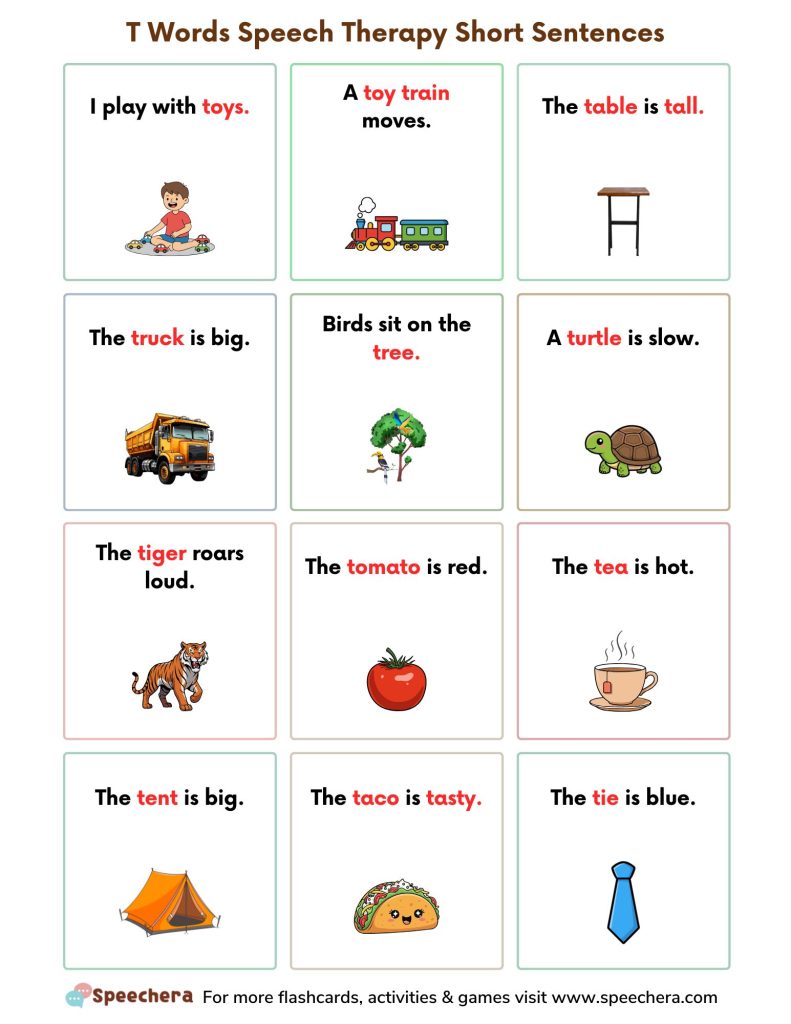 T Words Speech Therapy Short Sentences Worksheets Download this free set of speech therapy worksheets designed to target the /t/ sound using short, simple sentences. Children practice repeating sentences such as “I play with toys, A toy train moves, The table is tall, The truck is big, Birds sit on the tree, A turtle is slow, The tiger roars loud.” These short sentence activities help improve articulation, phonological awareness, sentence fluency, and sound carryover. This resource is ideal for SLPs, special education teachers, early intervention, autism therapy, and at-home speech practice.