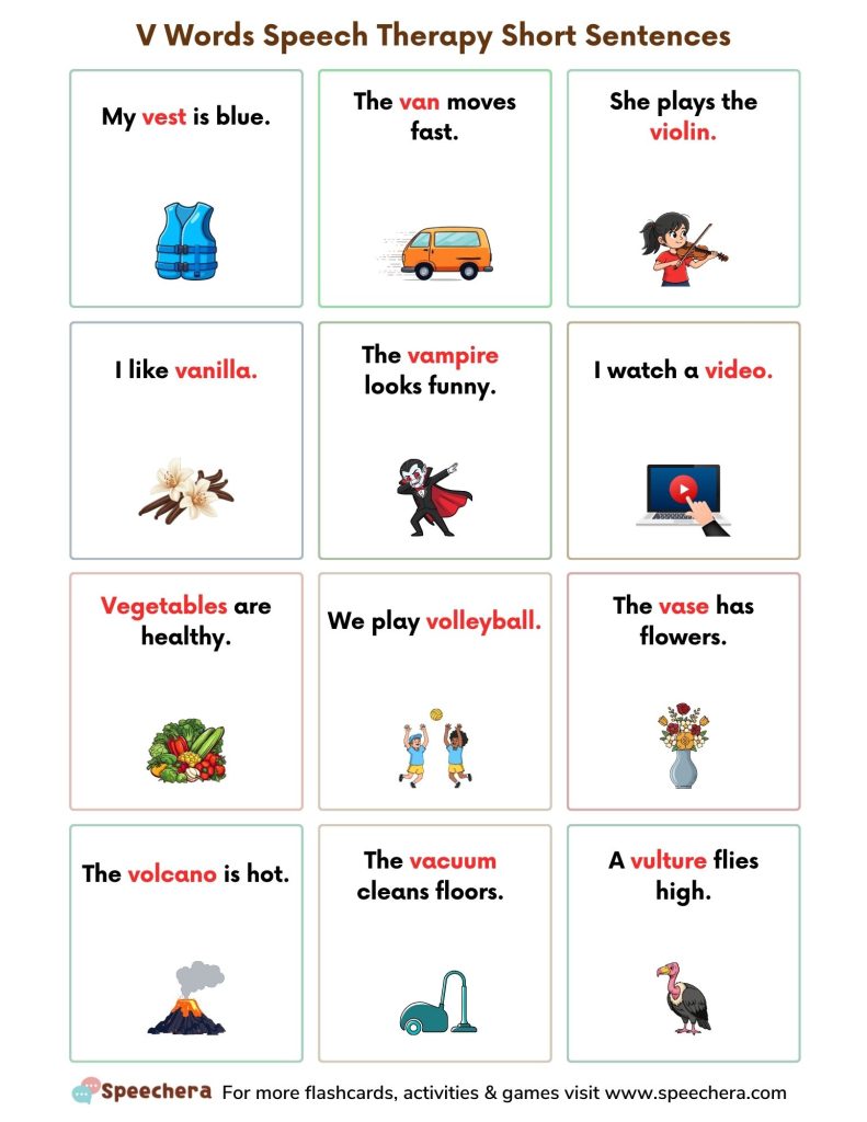 V Words Speech Therapy Short Sentences Worksheets Download this free set of speech therapy worksheets designed to target the /v/ sound using short, simple sentences. Children practice repeating sentences such as “My vest is blue, The van moves fast, She plays the violin, I like vanilla, The vampire looks funny, I watch a video, Vegetables are healthy”. These short sentence activities help improve articulation, phonological awareness, sentence fluency, and sound carryover. This resource is ideal for SLPs, special education teachers, early intervention, autism therapy, and at-home speech practice.