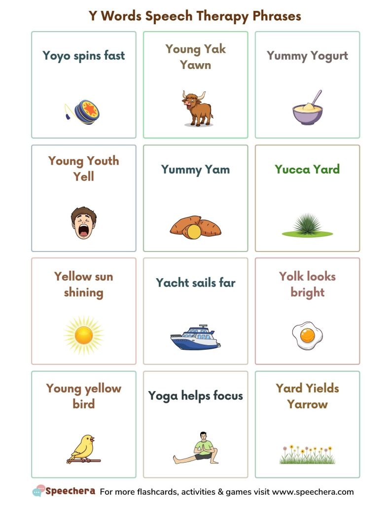 Y Words Speech Therapy Phrases Worksheets. Download this free set of speech therapy alliteration worksheets featuring phrases for the /y/ sound. Kids practice repeating short phrases such as Yoyo spins fast, Young Yak Yawn, Yummy Yogurt, Young Youth Yell, Yummy Yam, Yucca Yard, Yellow sun shining, etc…. to improve articulation, auditory discrimination, phonological awareness, and fluency. Useful for SLPs, special education teachers, early intervention, autism therapy, and at-home practice.