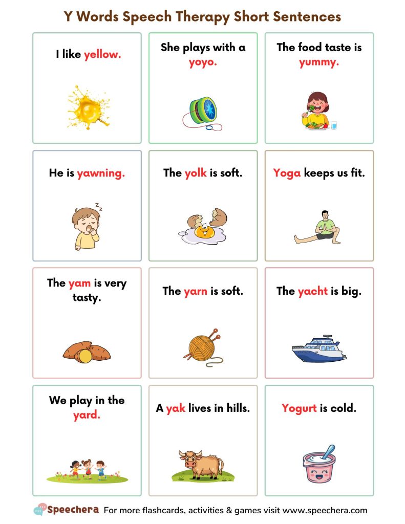 Y Words Speech Therapy Short Sentences Worksheets Download this free set of speech therapy worksheets designed to target the /y/ sound using short, simple sentences. Children practice repeating sentences such as “I like yellow, She plays with a yoyo, The food taste is yummy, He is yawning, The yolk is soft, Yoga keeps us fit, The yam is very tasty.” These short sentence activities help improve articulation, phonological awareness, sentence fluency, and sound carryover. This resource is ideal for SLPs, special education teachers, early intervention, autism therapy, and at-home speech practice.
